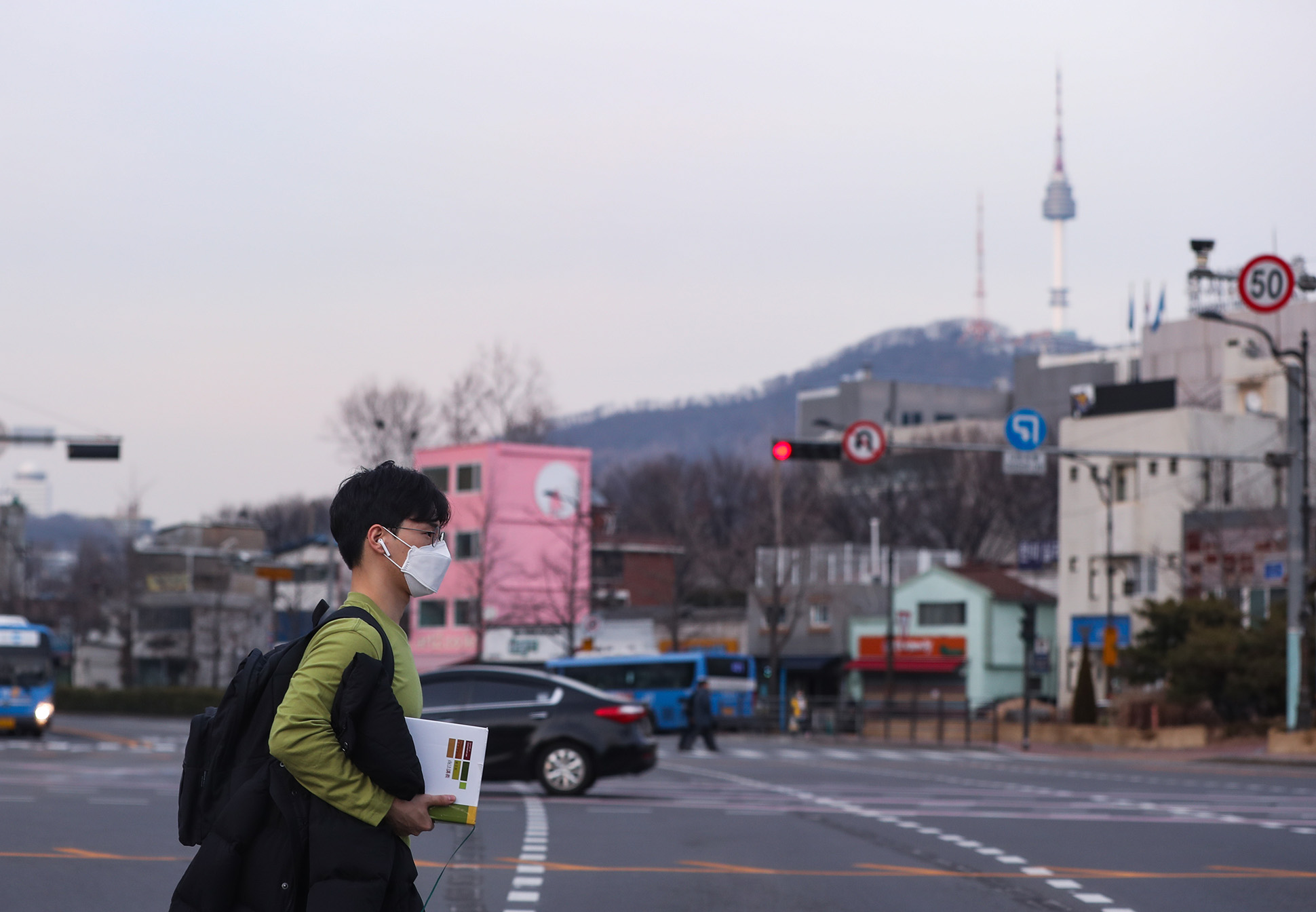 ▲2020年2月24日,韩国首尔,一名男子行走在龙山区的道路上。韩国总统文在寅2月23日宣布,依据传染病专家意见和建议,政府决定把新冠肺炎传染病危机预警提升至最高的“严重”级别。
