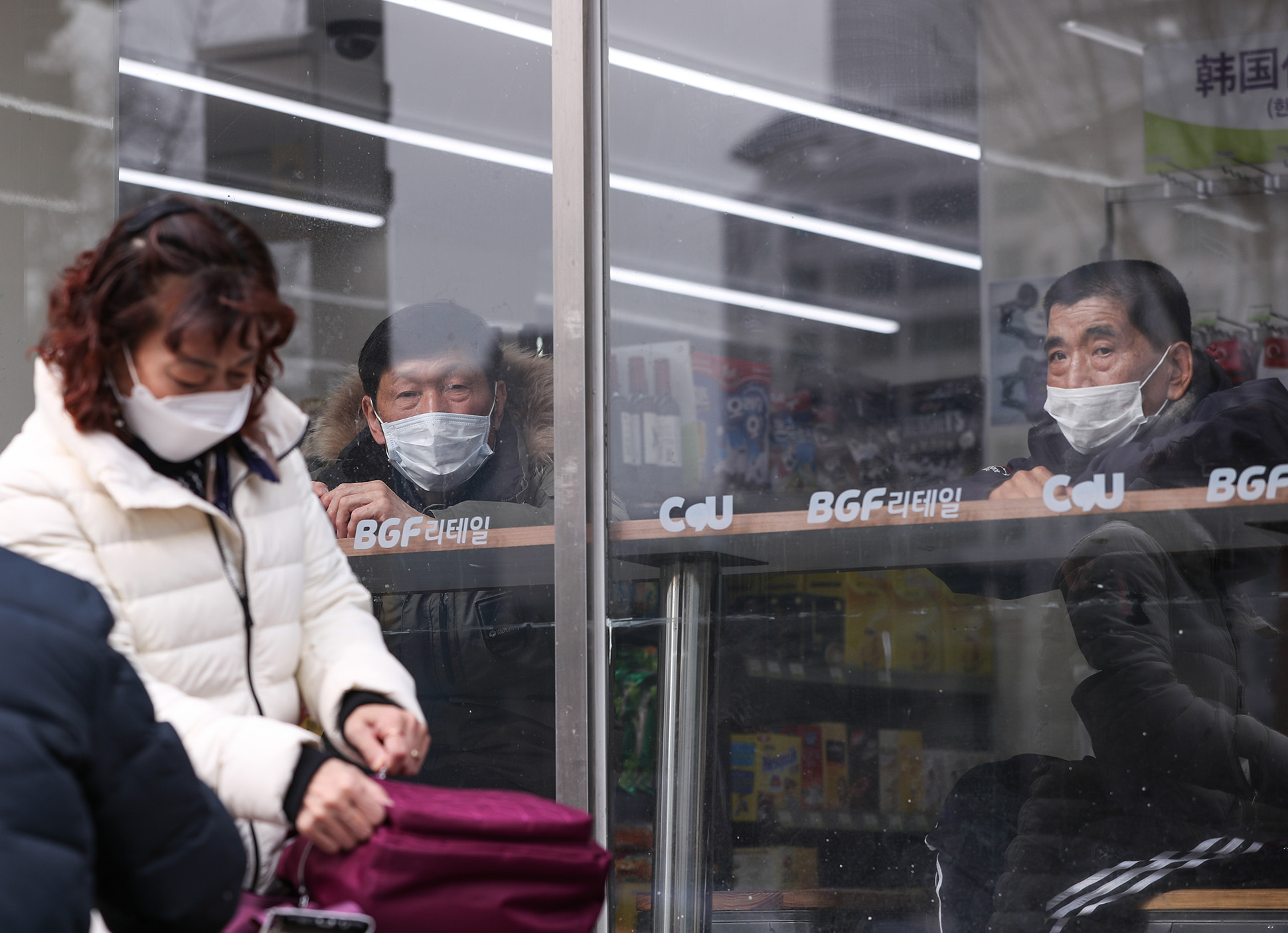 ▲2020年2月21日,韩国首尔,人们在一家便利店内休息。