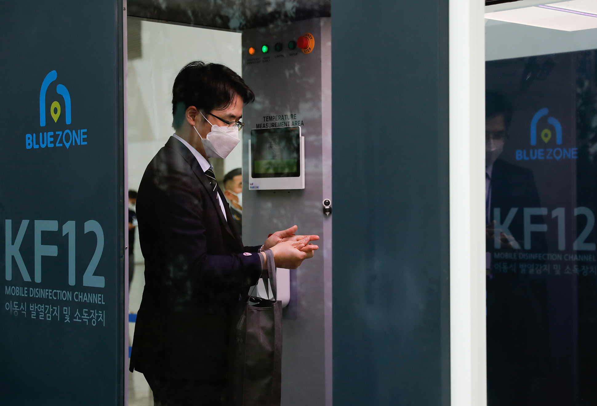 ▲2020年11月18日,在位于韩国京畿道高阳市的韩国国际展览中心,一名男子经过移动测温消毒通道进入展会现场。韩国中央灾难安全对策本部在11月17日宣布,将首尔、仁川、京畿道等首都圈地区及江原道部分地区的保持社交距离防疫级别从1级上调至1.5级,以应对新冠疫情在当地持续扩散。