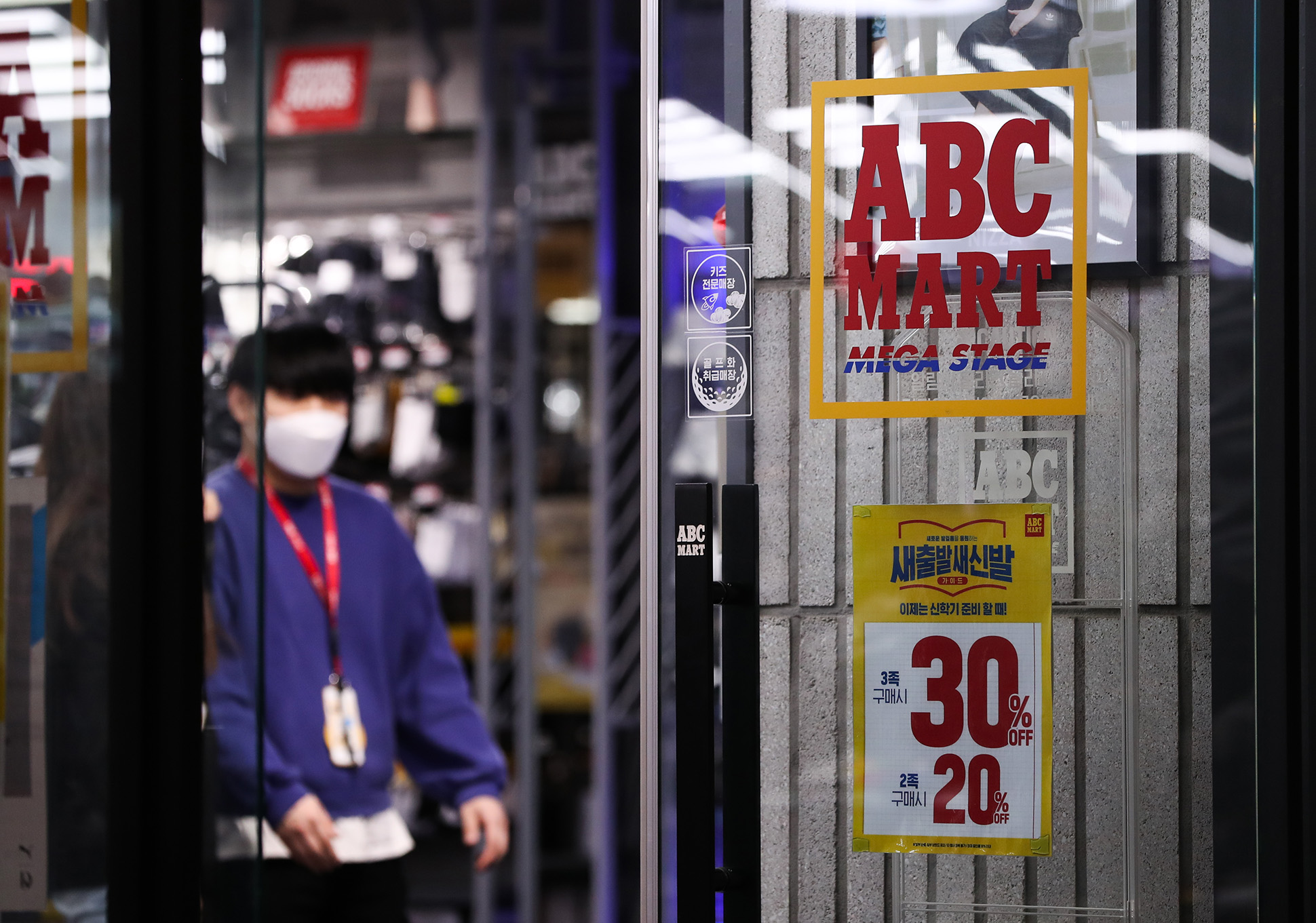 ▲2020年2月27日,在韩国首尔,明洞一家运动鞋专卖店贴出打折信息,店内只有店员没有客人。