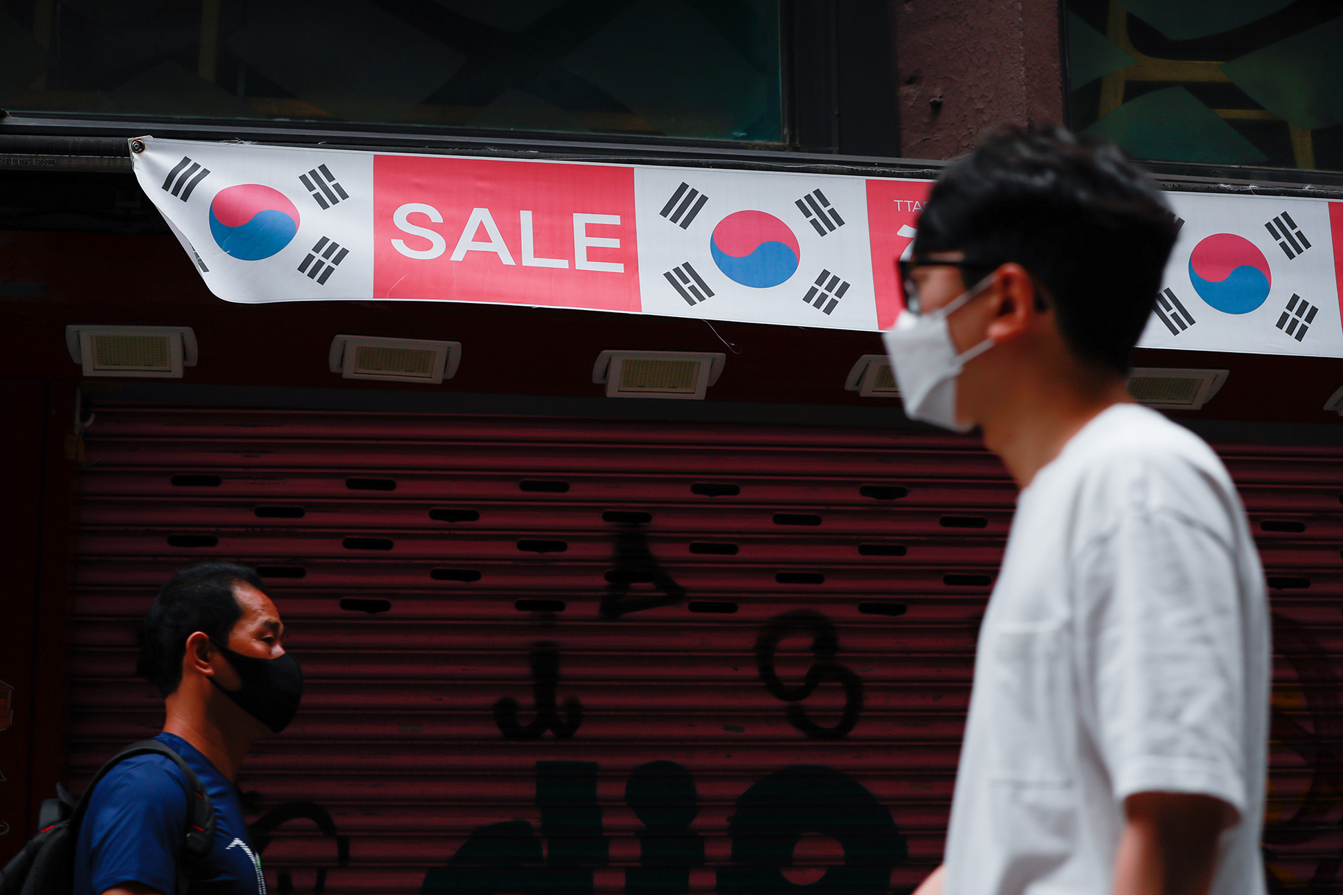 ▲2020年9月5日,戴口罩的人们经过韩国首尔明洞一处商品打折的横幅。