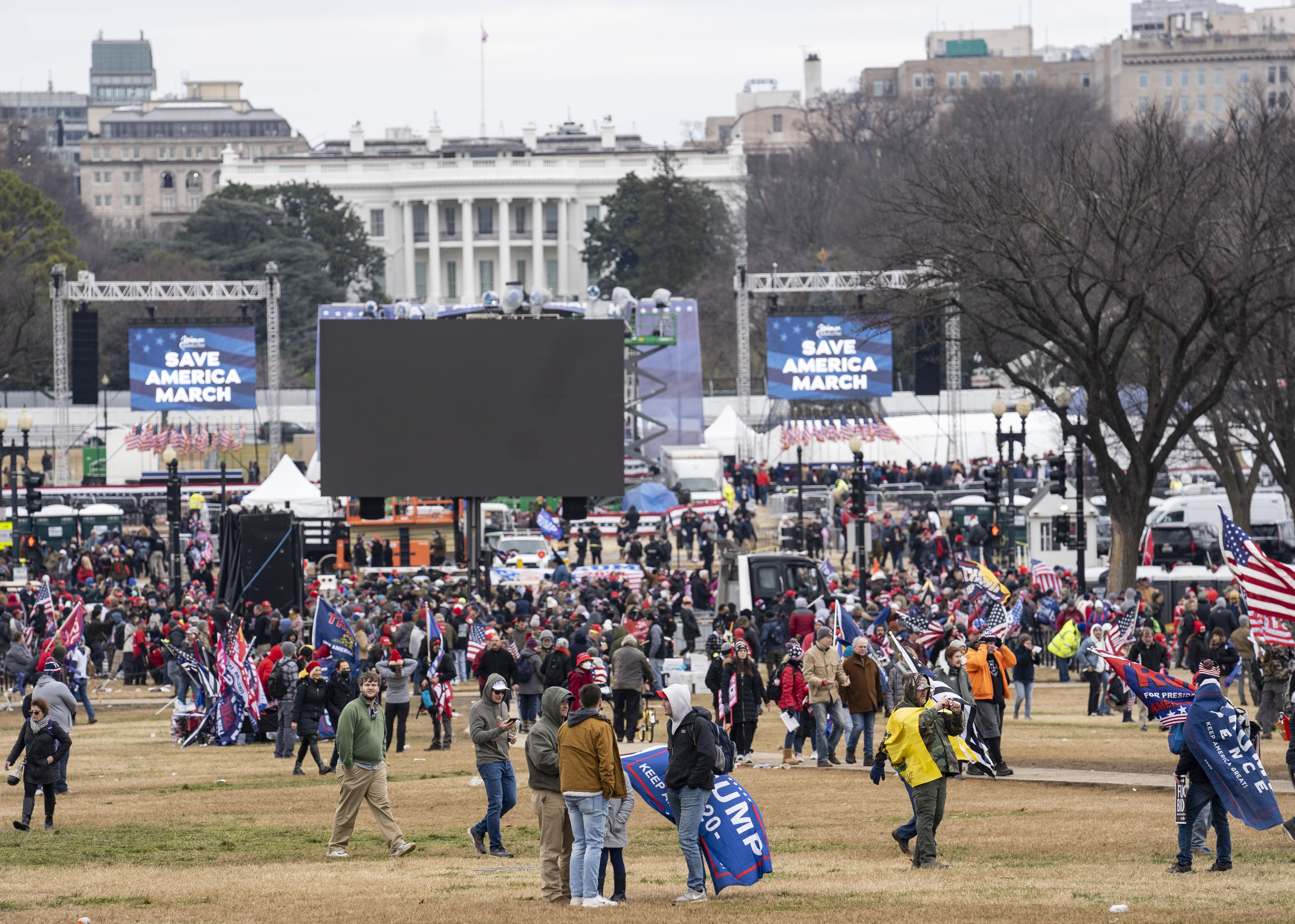 1月6日,在美国首都华盛顿,美国总统特朗普的支持者在国会外举行示威游行。美国首都华盛顿当地时间6日发生暴力示威。部分示威者冲进国会大厦,与警方发生冲突,造成4人死亡,当时正在举行的认证大选结果的国会参众两院联席会议也被迫中断。(新华社记者刘杰摄)
