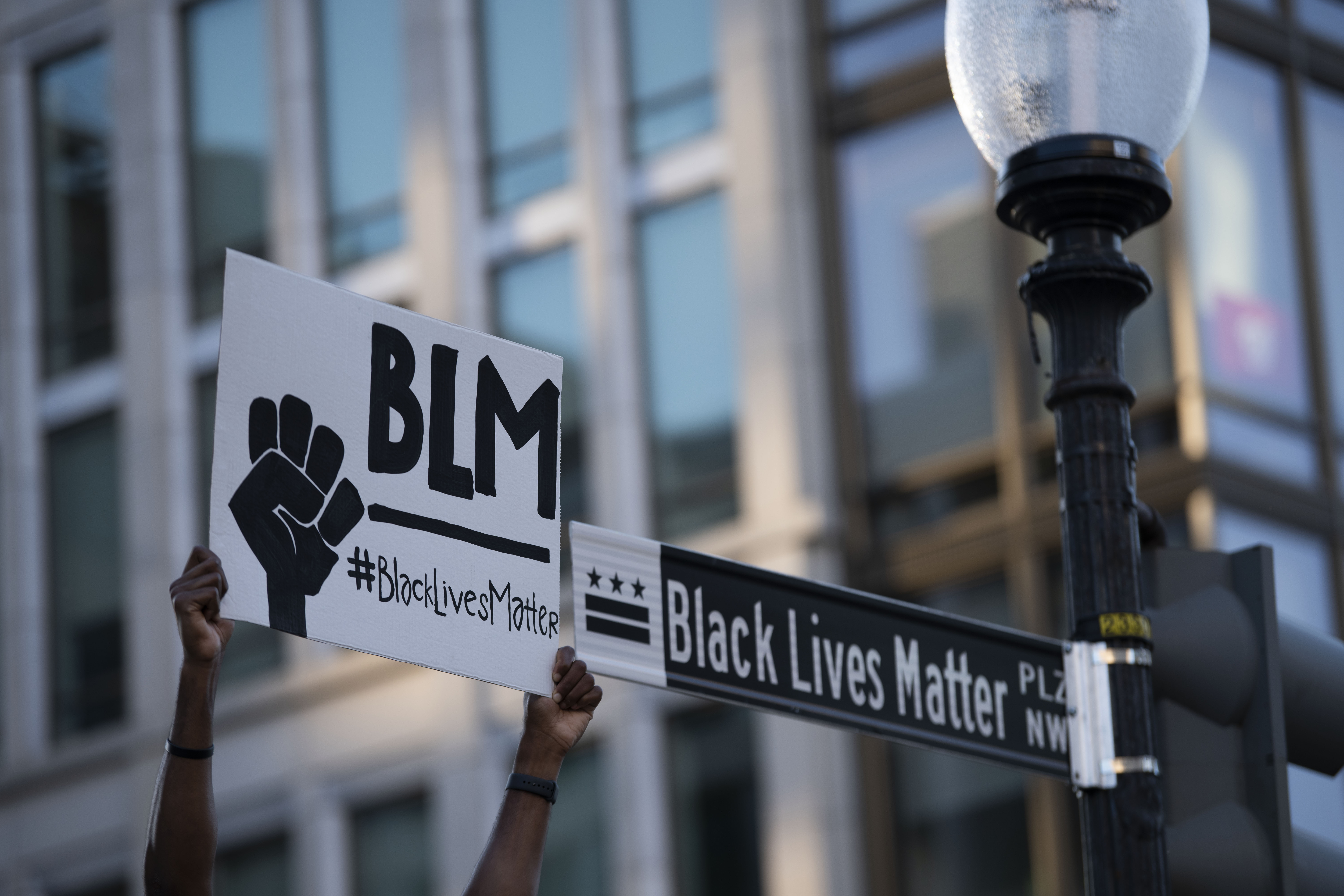2020年6月8日,一名男子在美国华盛顿白宫附近手举“黑人的命也是命”的标语,抗议警察暴力执法致非裔男子乔治·弗洛伊德丧生。(新华社记者刘杰摄)