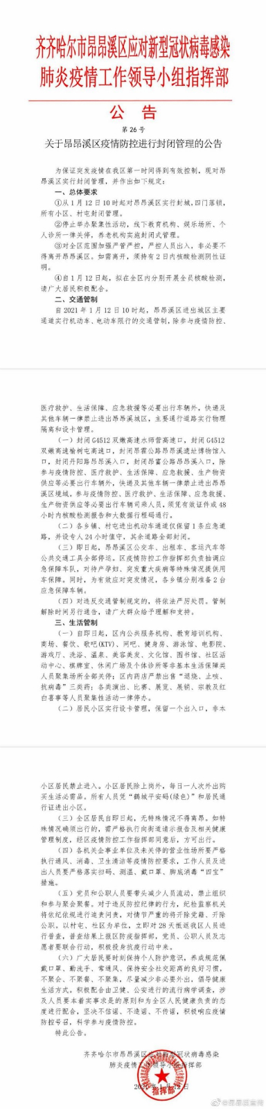 1月12日14时,黑龙江省齐齐哈尔市昂昂溪区委宣传部官方微博“昂昂溪宣传”发布公告第26号,公告中指出齐齐哈尔市昂昂溪区于12日10时起正式实行封闭管理,并执行交通管制、生活管制。并在留言中表示一切以官方发布信息为准,不信谣,不传谣,请大家做好个人防护,尽量减少外出!(总台央视记者 郭晓光)