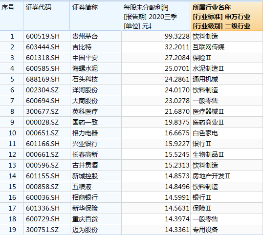 那么,哪些公司会具备高分红潜力呢?中国证券报记者梳理发现,2020年三季报中每股未分配利润大于1元的上市公司有2622家,大于5元的有287家,大于10元的有50家,贵州茅台、吉比特、中国平安、海螺水泥、石头科技、洋河股份、大商股份、英科医疗等9家公司每股未分配利润超过20元。