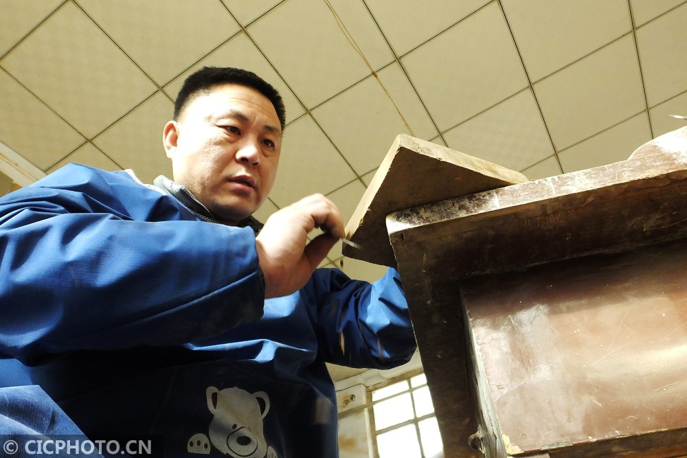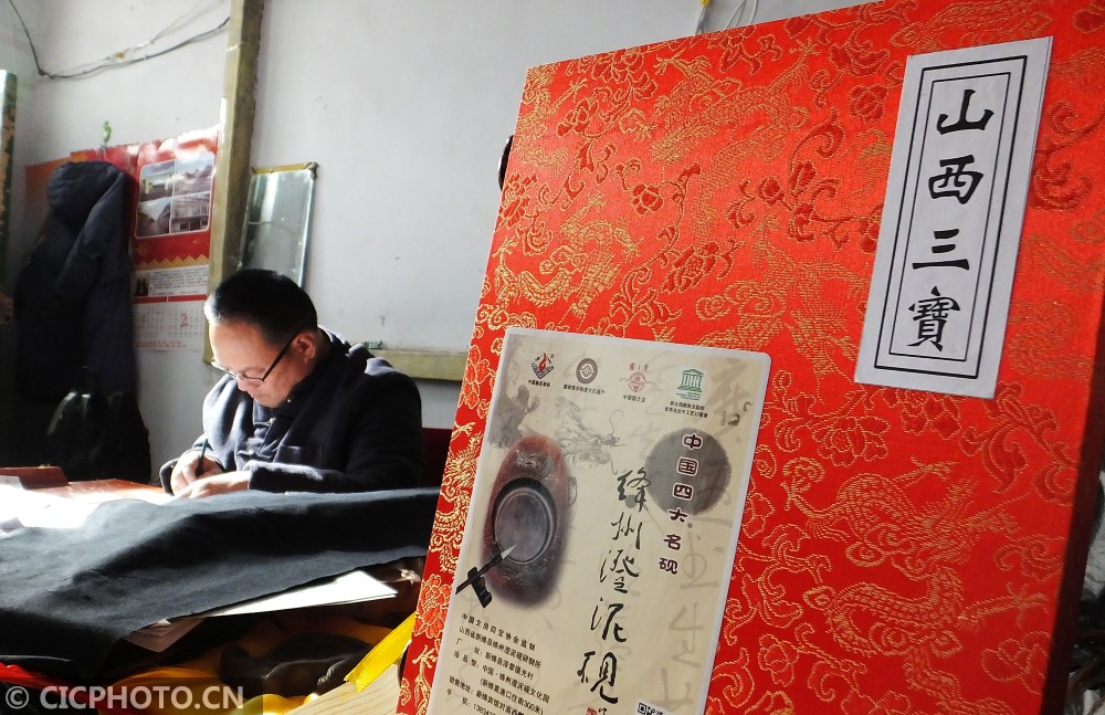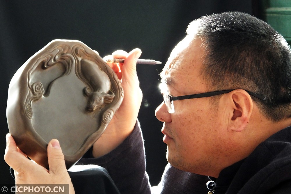↑2021年1月11日,在山西运城市新绛县国家级非遗绛州澄泥砚文化园,轻工大国工匠蔺涛在修饰绛州澄泥砚生肖牛砚。CICPHOTO/高新生 摄