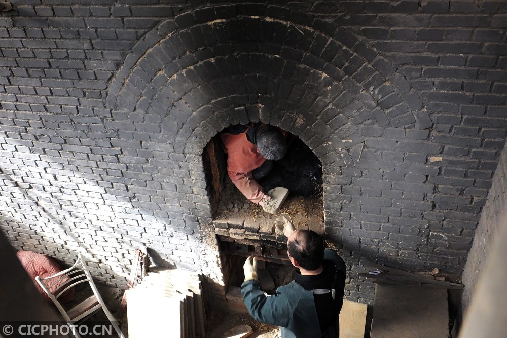 ↑2021年1月11日,在山西运城市新绛县国家级非遗绛州澄泥砚文化园,制砚工艺师在装窑烧制绛州澄泥砚生肖牛砚。CICPHOTO/高新生 摄