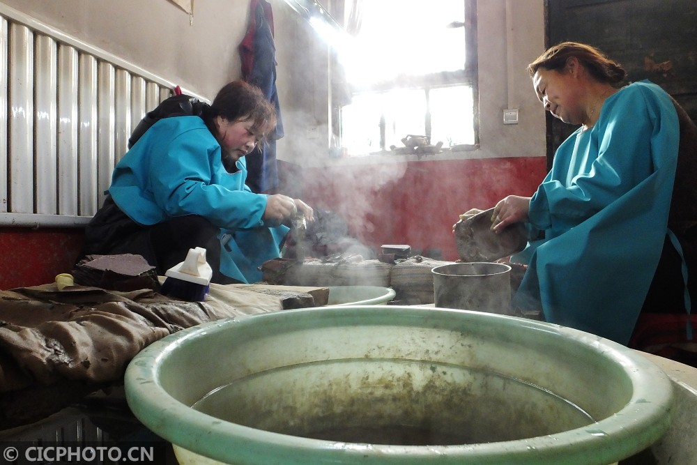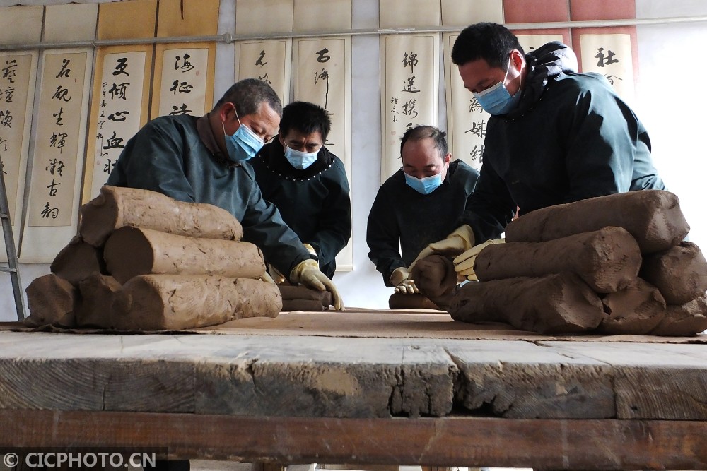 ↑2021年1月11日,在山西运城市新绛县国家级非遗绛州澄泥砚文化园,制砚工艺师加紧揉制绛州澄泥砚生肖牛砚用泥。CICPHOTO/高新生 摄