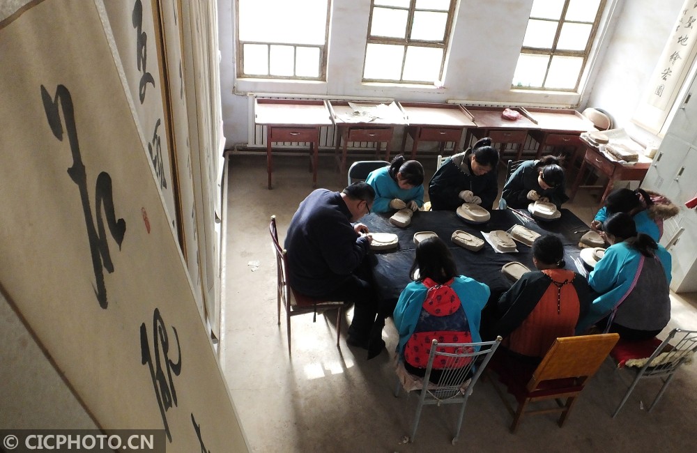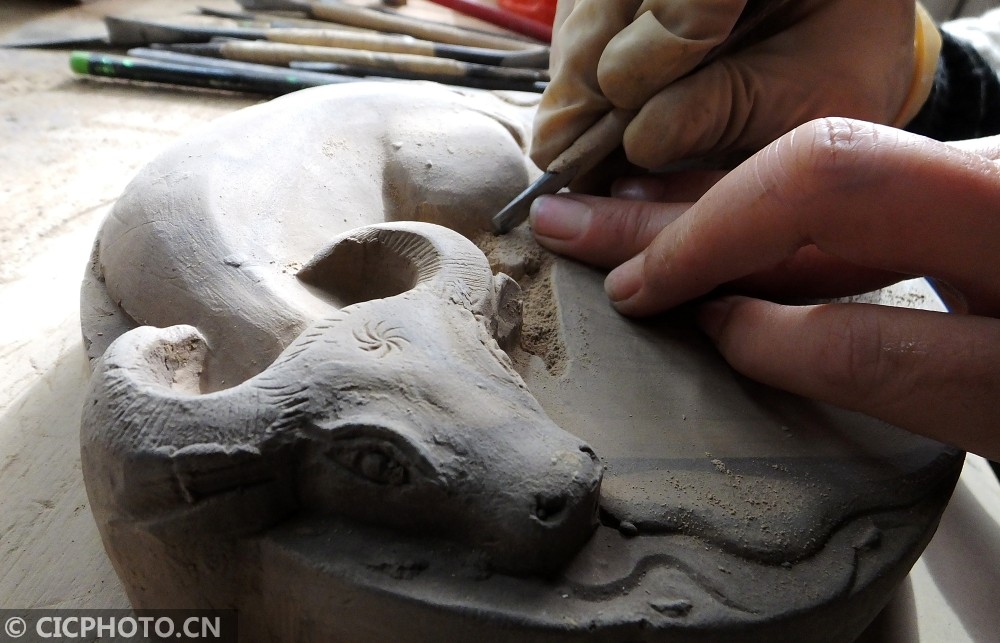 ↑2021年1月11日,在山西运城市新绛县国家级非遗绛州澄泥砚文化园,制砚工艺师在修饰绛州澄泥砚生肖牛砚。CICPHOTO/高新生 摄