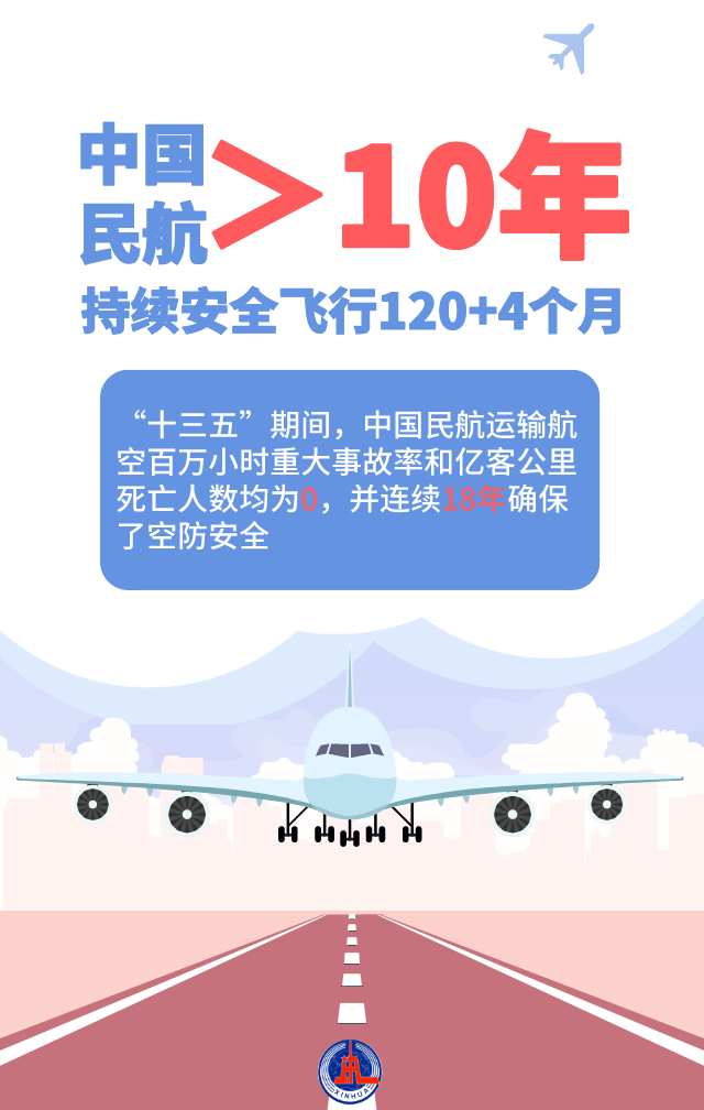 此外,“十三五”期间,中国民航运输航空百万小时重大事故率和亿客公里死亡人数均为0,并连续18年确保了空防安全。截至目前持续安全飞行“120+4”个月,安全水平稳居世界前列。