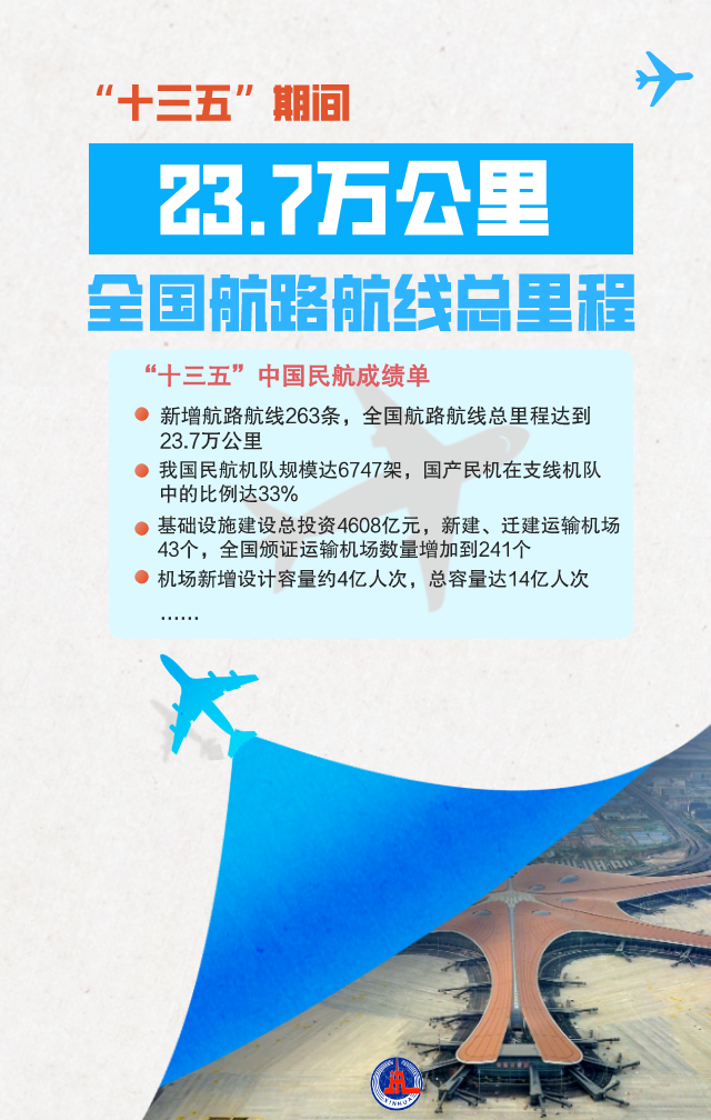 2020年,中国民航“十三五”圆满收官。冯正霖认为,这是中国民航发展增量最大、综合效益持续提升、安全纪录最好的五年。“十三五”期间,全国航路航线总里程达到23.7万公里,新建、迁建运输机场43个,新增航路航线263条。民航机队规模达6747架,国产民机在支线机队中的比例达33%。