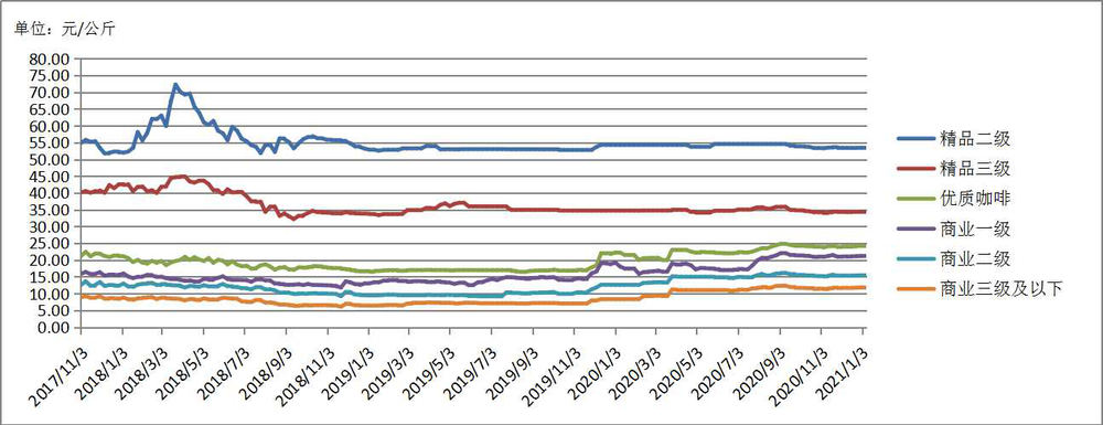 具体来看,精品二级咖啡豆均价报53.41元/公斤,较上期下跌0.02元/公斤,跌幅0.04%;精品三级咖啡豆均价报34.25元/公斤,较上期下跌0.10元/公斤,跌幅0.29%;优质咖啡豆均价报24.06元/公斤,较上期下跌0.12元/公斤,跌幅0.50%;商业一级咖啡豆均价报21.13元/公斤,较上期下跌0.08元/公斤,跌幅0.38%;商业二级咖啡豆均价报15.37元/公斤,较上期下跌0.08元/公斤,跌幅0.52%;商业三级及以下咖啡豆均价报11.74元/公斤,较上期下跌0.05元/公斤,跌幅0.42%。