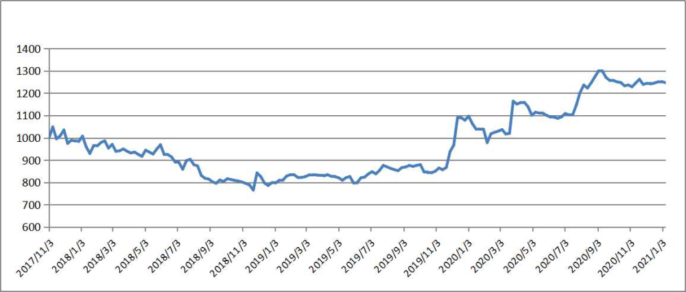 1月8日,指数报1246.66点,较上期(2020.12.28-2021.1.3,下同)下跌5.20点,跌幅0.42%,与基期相比上涨246.66点,涨幅24.67%。