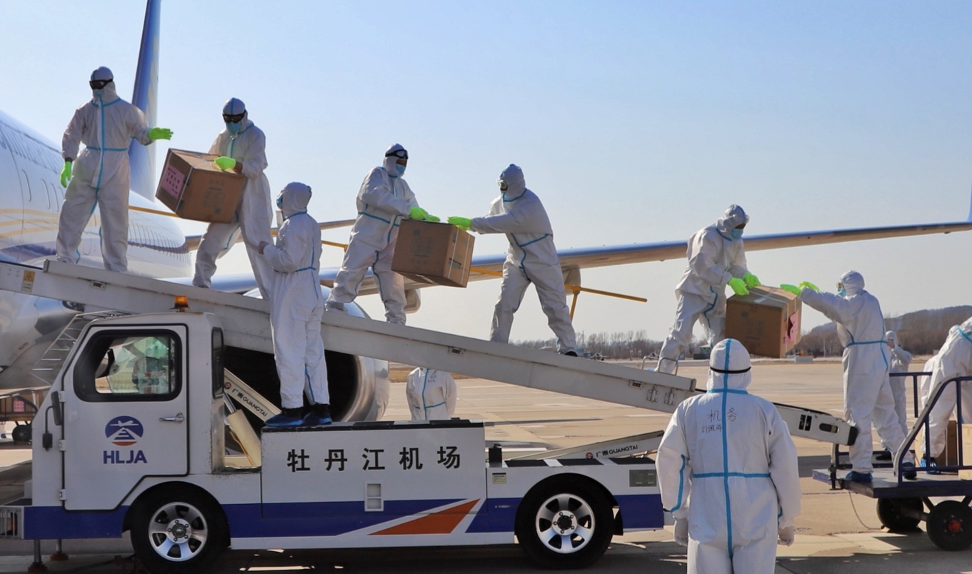 4月15日,在牡丹江机场,工作人员在卸货。新华社发