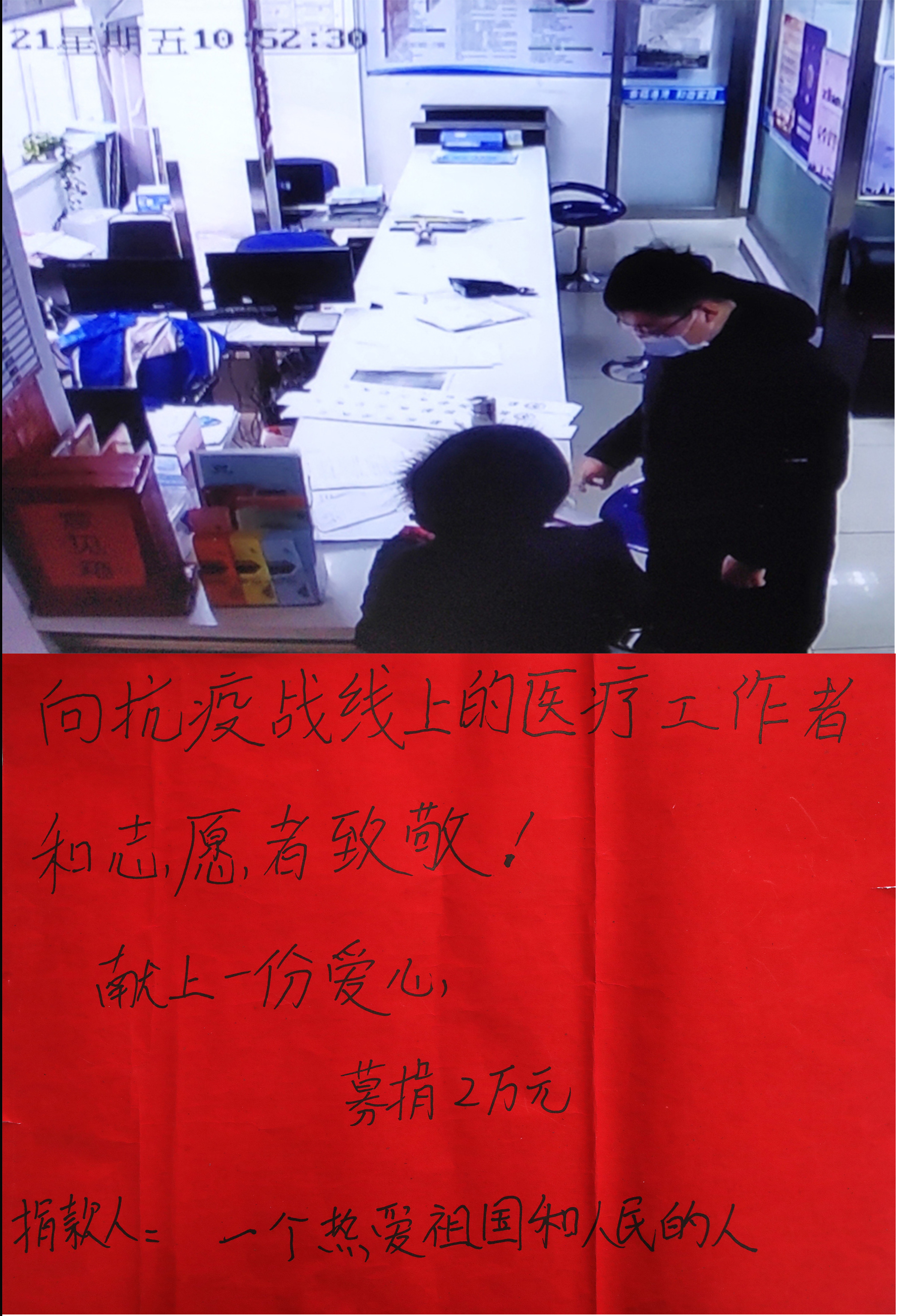 大家展开红纸,看到了两万元钱,纸上写着:向抗疫战线上的医疗工作者和志愿者致敬!捐款人:一个热爱祖国和人民的人。