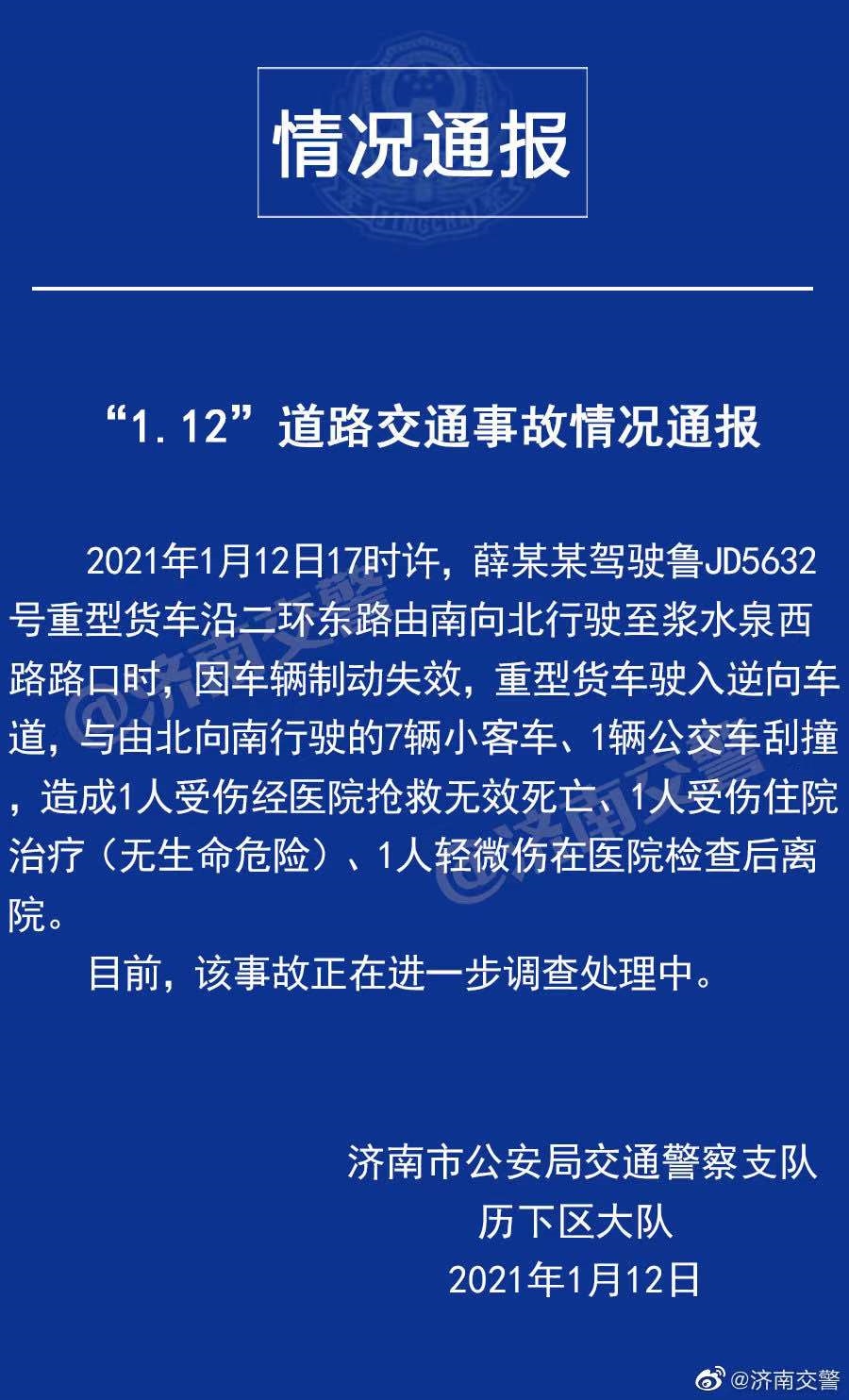 据山东省济南市公安局交通警察支队历下区大队通报,2021年1月12日17时许,薛某某驾驶鲁JD5632号重型货车沿山东济南二环东路由南向北行驶至浆水泉西路路口时,因车辆制动失效,重型货车驶入逆向车道,与由北向南行驶的7辆小客车、1辆公交车刮撞,造成1人受伤经医院抢救无效死亡、1人受伤住院治疗(无生命危险)、1人轻微伤在医院检查后离院。
