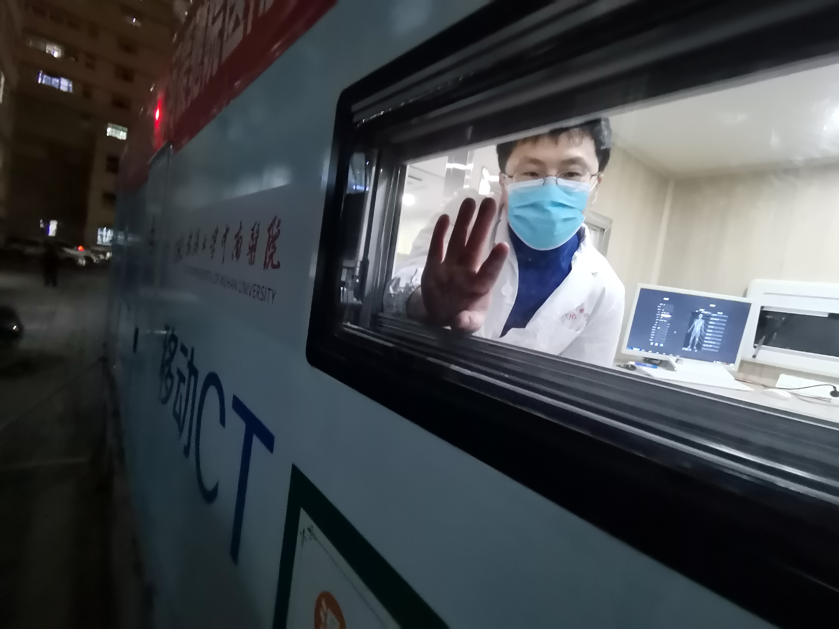 1月10日,随车出发的医学影像科技师叶乃力在发车前挥手致意。