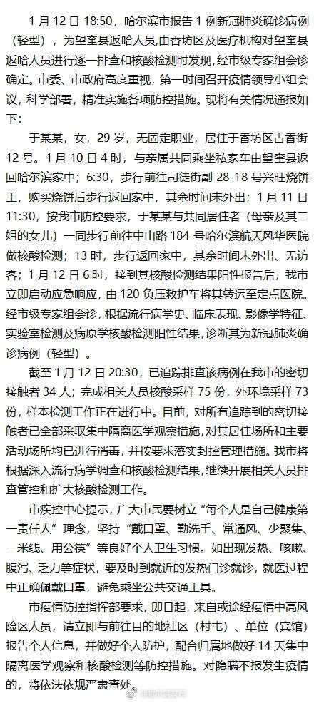 1月12日18:50,黑龙江哈尔滨市报告1例新冠肺炎确诊病例(轻型),具体情况如下: