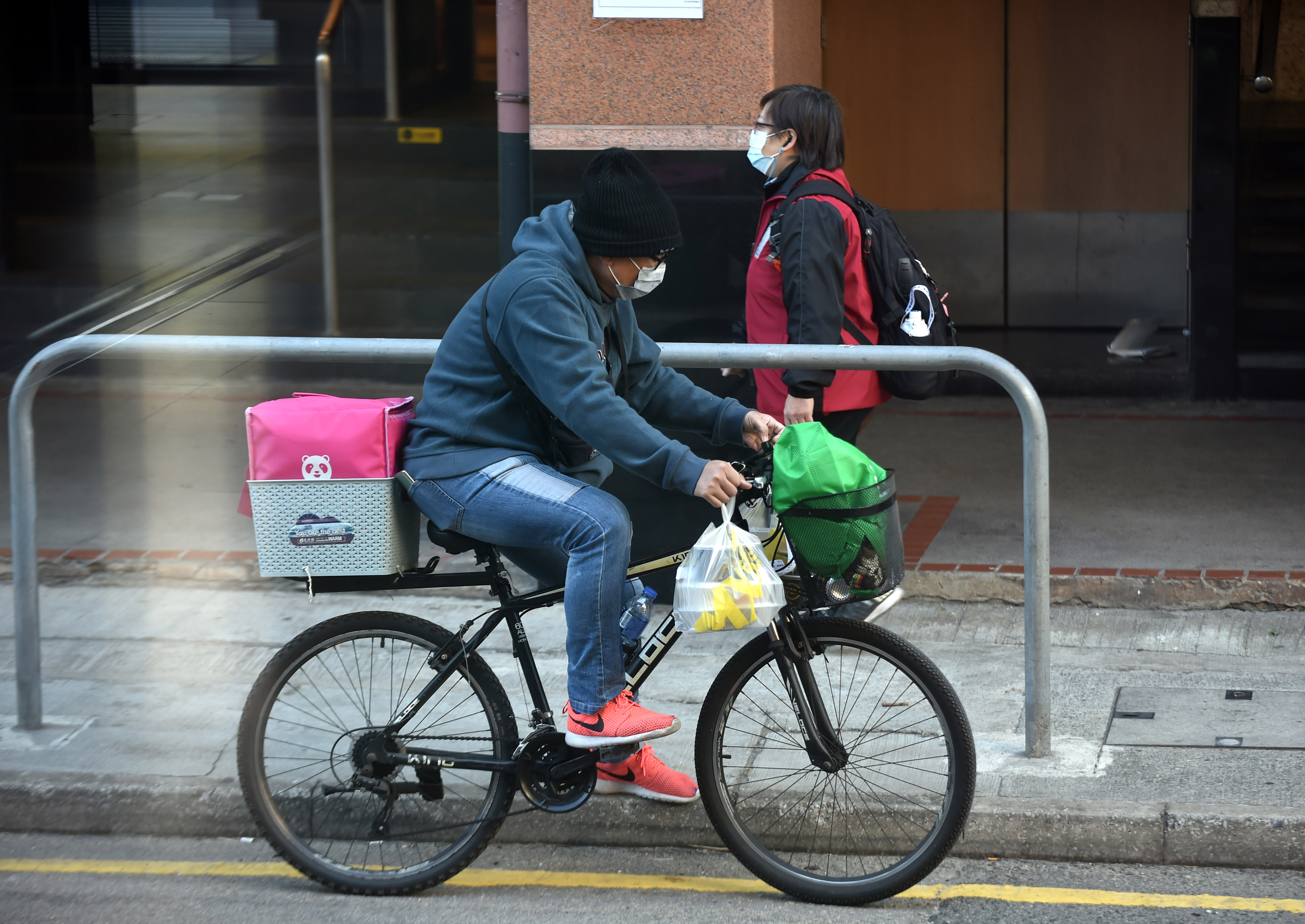 在香港街头,戴着口罩的员工骑自行车送餐(1月12日摄)。新华社记者卢炳辉摄
