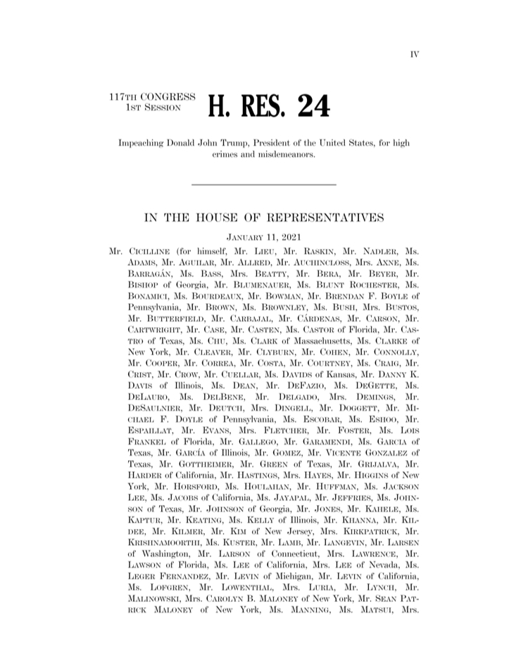 美国国会众议院于当地时间1月12日发布了美国总统特朗普弹劾草案的最终版本,这项草案的标题是“以重罪和行为失检弹劾总统唐纳德·约翰·特朗普”。