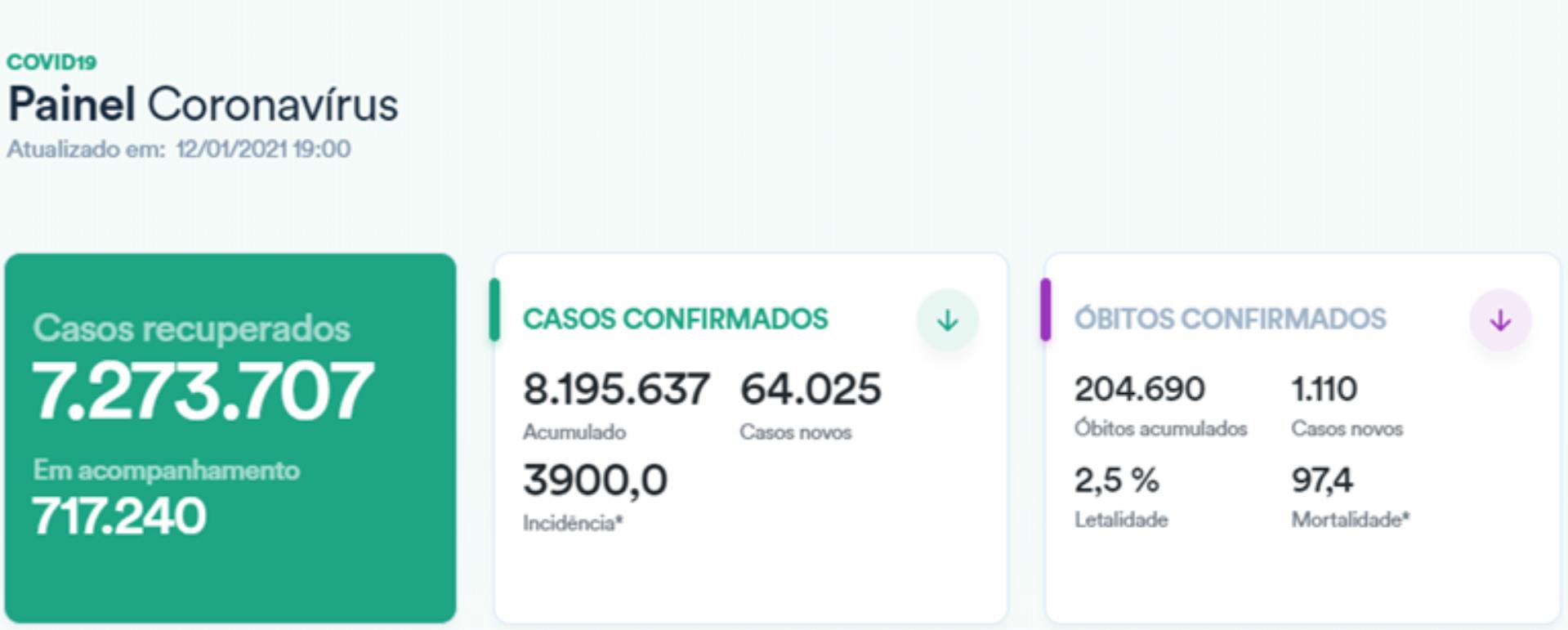 截至当地时间1月12日,据巴西卫生部发布的数据,该国全国新冠肺炎确病例累计达到8195637例,达64025例,累计死亡病例204690例,单日新增死亡病例达1110例。累计康复人数7273707人。