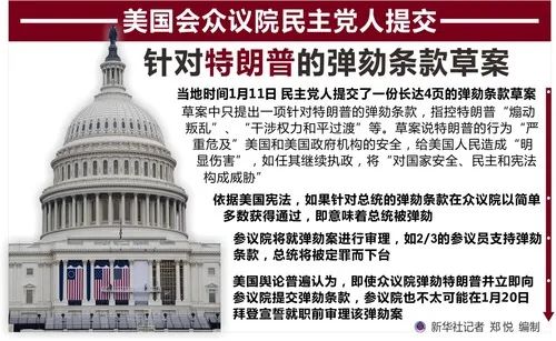 美国国会众议院民主党人11日正式提交针对总统特朗普的弹劾条款草案,指控特朗普“煽动叛乱”。