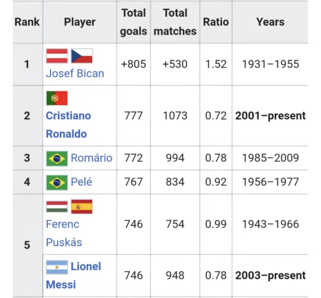 怎么C罗759球就排第一了?