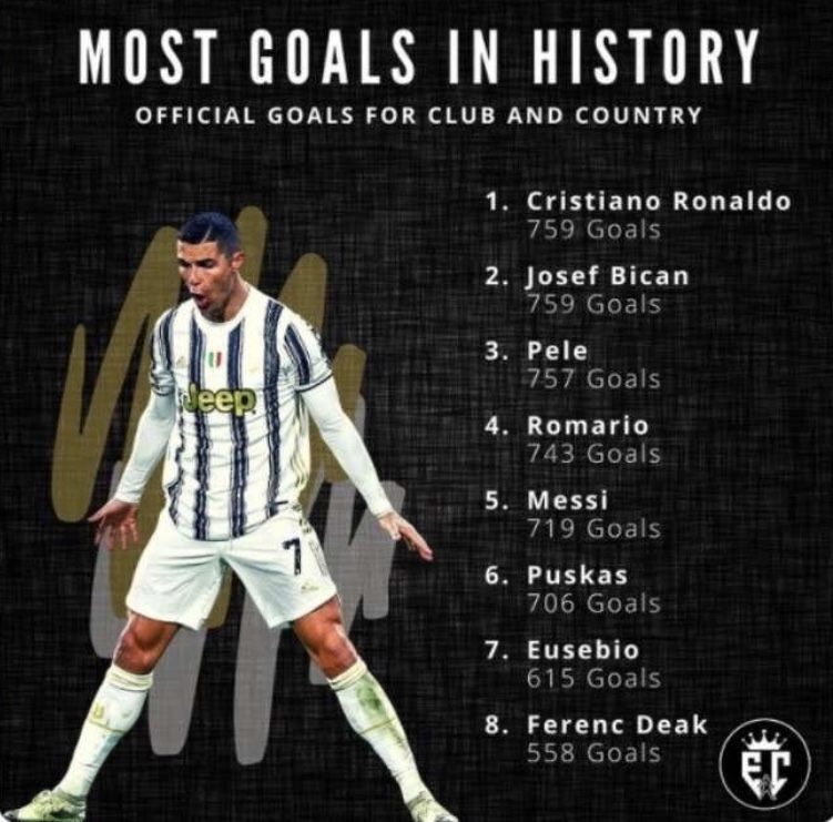 C罗职业生涯进球数达到759个