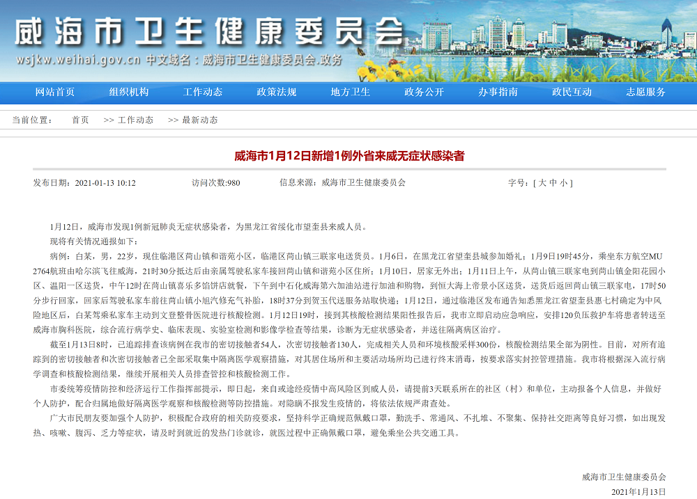 记者今天(1月13日)从山东省威海市卫健委了解到,1月12日,威海市发现1例新冠肺炎无症状感染者,为黑龙江省绥化市望奎县来威人员,详细情况通报如下: