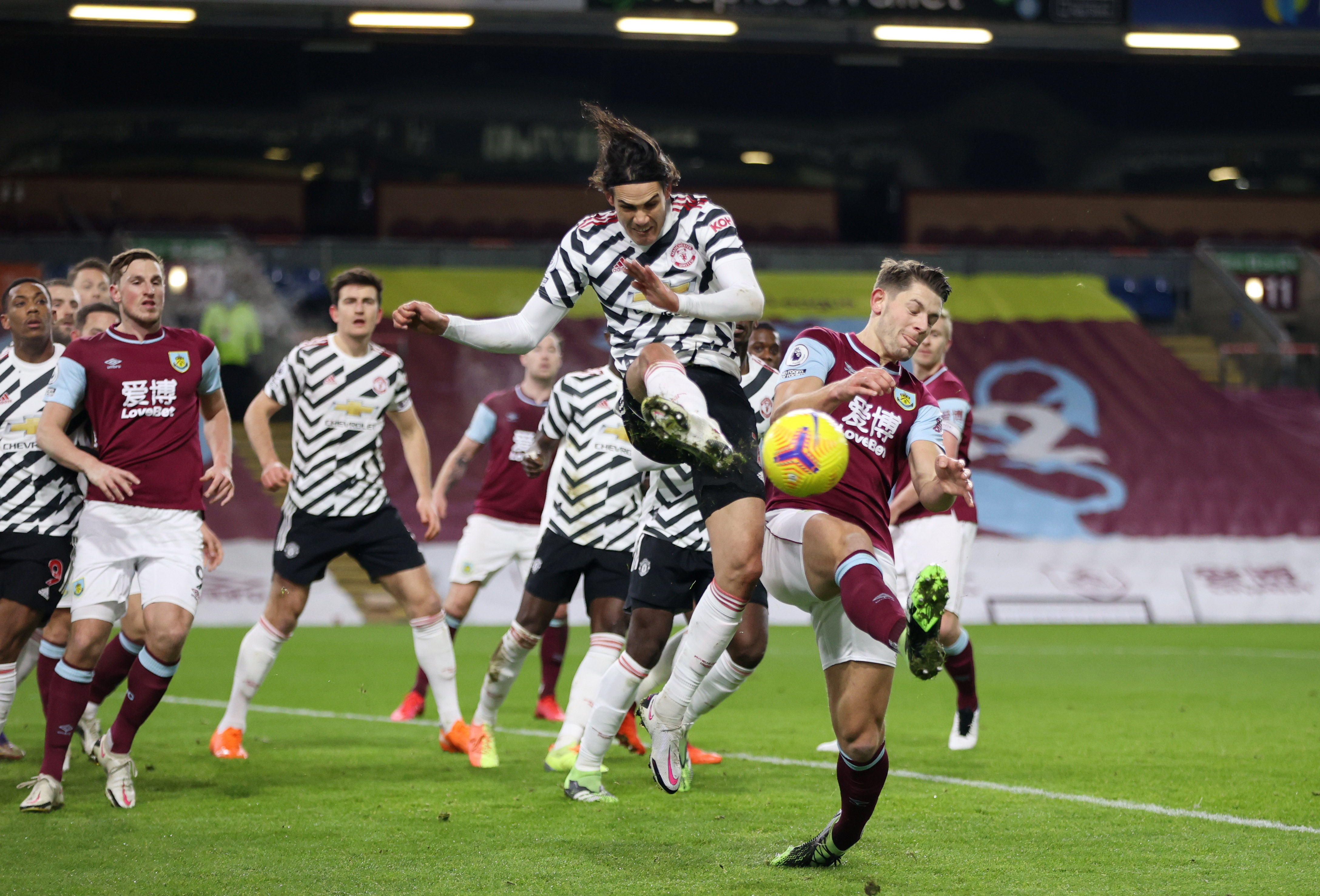 1月12日,曼联队球员卡瓦尼(前左)在比赛中和伯恩利队球员塔尔科夫斯基拼抢。