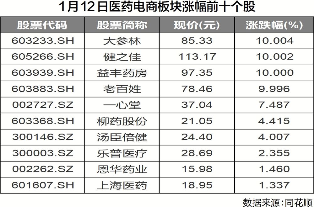 新华社北京1月13日电(记者张小洁)医药电商概念12日走强,同花顺医药电商指数收涨2.26%,板块内27只个股中19只上涨。A股五家上市连锁药店集体大涨,包揽医药电商板块涨幅前五,大参林、健之佳、益丰药房、老百姓涨停。