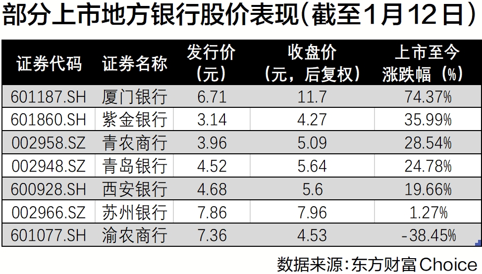另一方面,从市场表现来看,已上市地方银行股价表现出现分化。厦门银行当前价格较发行价(后复权、下同)上涨了74%,2019年上市的紫金银行上涨近36%,青农商行、青岛银行涨幅超过20%,但渝农商行较发行价跌幅已经超38%。