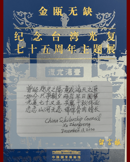 国台办发言人朱凤莲13日应询介绍,“金瓯无缺——纪念台湾光复七十五周年主题展”自2020年10月25日开幕以来,受到广泛关注,观众观展非常踊跃。所有的留言都强烈地表达了一种希望祖国能够早日统一的迫切心情。(动图制作:陈舒)