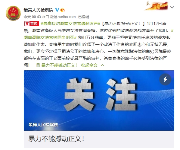 1月12日清晨,湖南省高级人民法院法官周春梅不幸遇害。今日(13日),最高人民检察院通过官方微博发声:1月12日清晨,湖南省高级人民法院女法官周春梅,这位优秀的政法战线战友离开了我们。我们万分悲痛,更悲于坚守司法责任底线的战友却遭如此伤害。春梅用生命向我们诠释了一个政法工作者的赤胆忠心和无私无畏,我们,更应坚定捍卫司法公正的信仰和决心。一切肆意践踏法律的卑劣灵魂最终都将在崇高的正义面前接受最严酷的审判,杀害春梅的凶手必将受到法律的严惩!