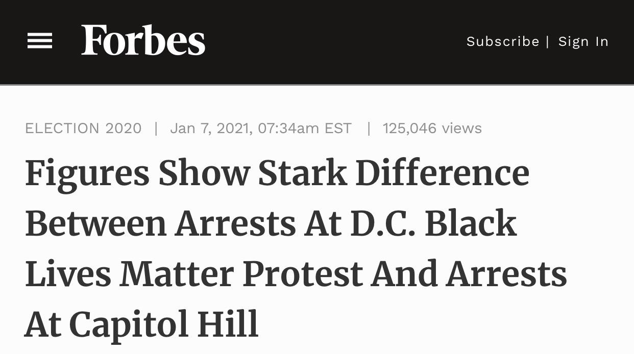 △《福布斯》报道,“黑人的命也是命”抗议活动中的被捕人数,与国会山遭抗议冲突事件中的被逮捕人数相比,呈现极大差异