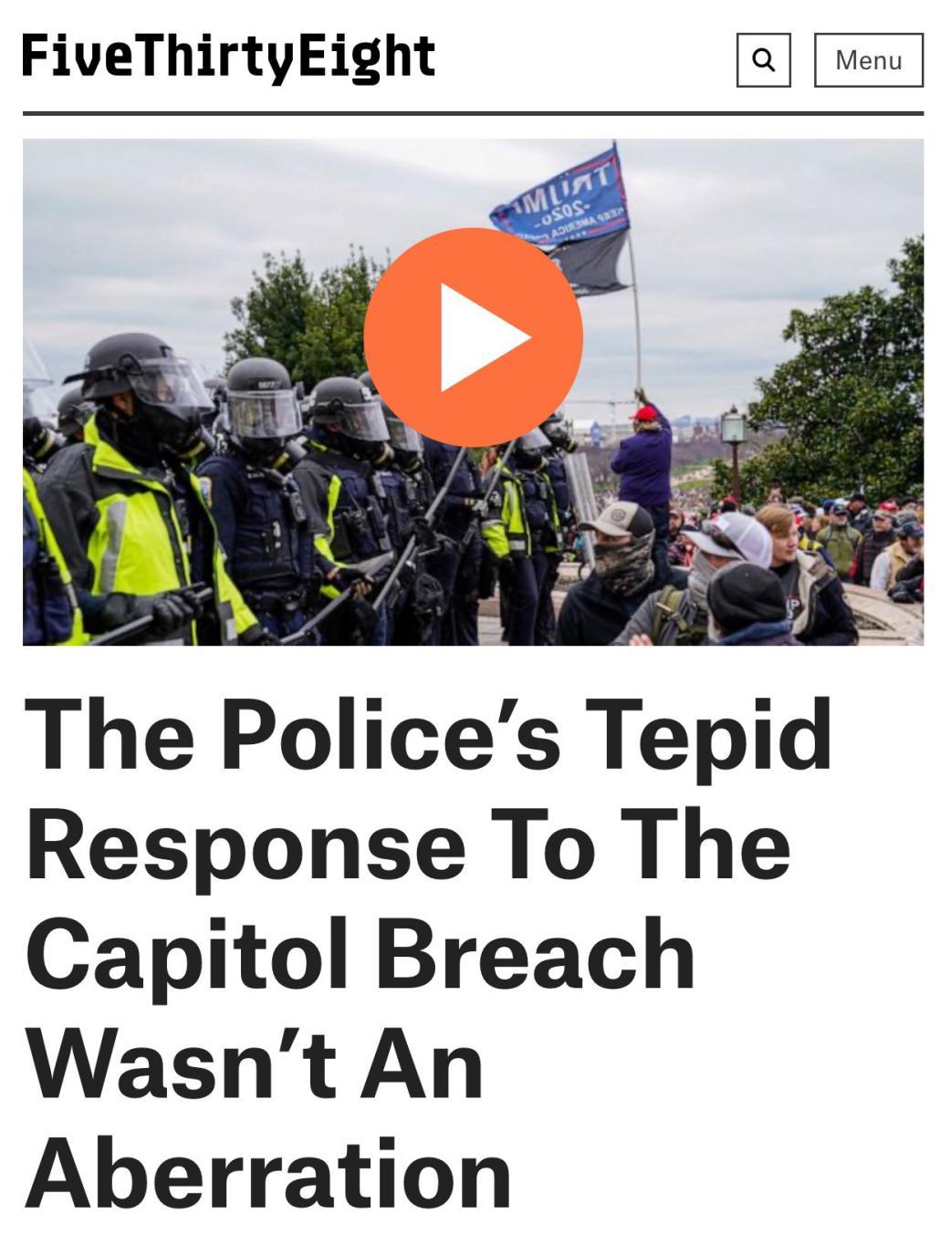 △美国538民调机构指出,警察对国会山抗议者的温和处理是一种惯例