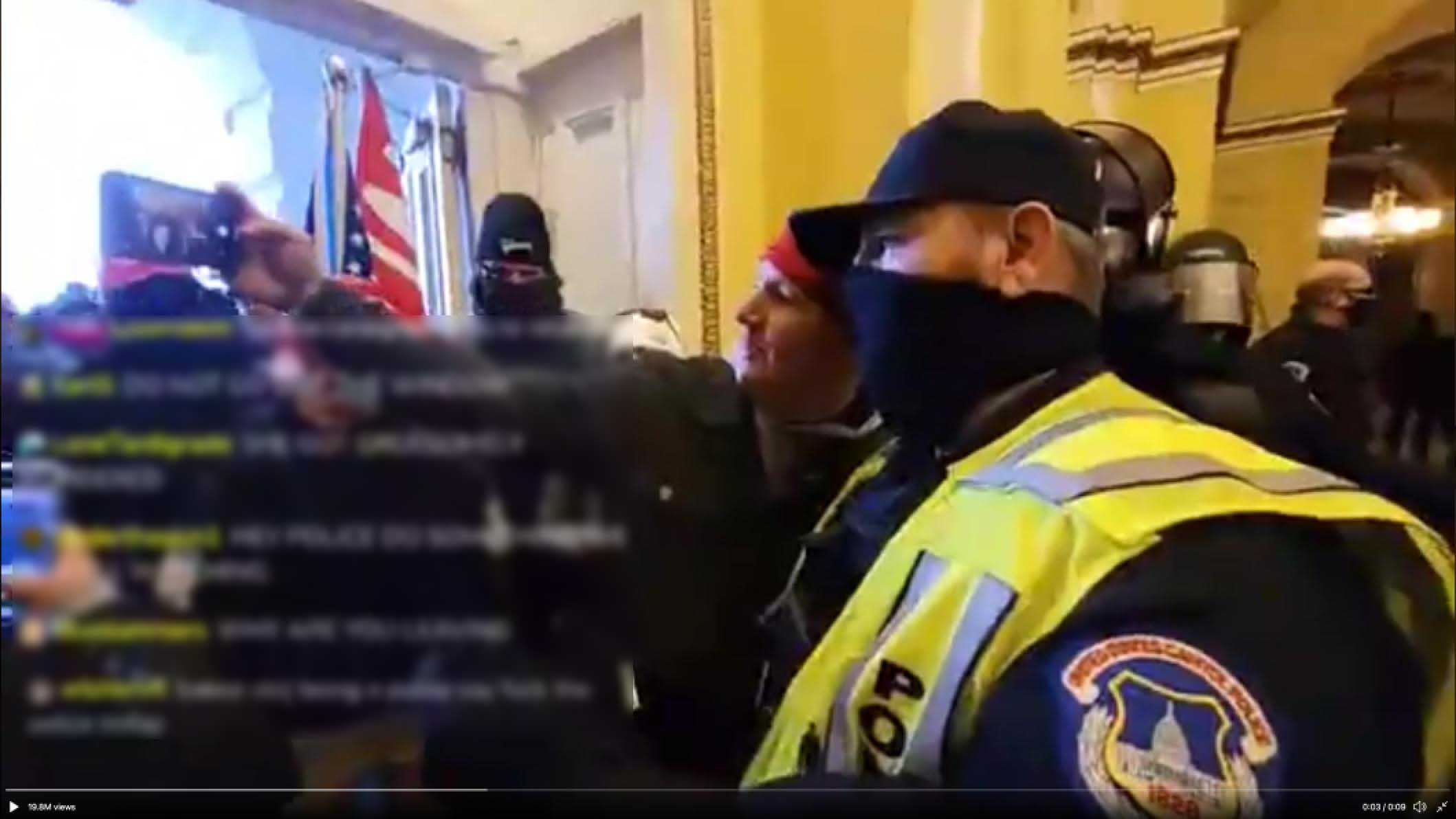 而在抗议冲突当天,警察对抗议者的态度也十分温和。一些现场视频显示,示威者们打碎了国会大厦玻璃,冲进大厦内部,肆意毁坏设施,甚至用旗杆疯狂攻击警察。尽管如此,警方却只是象征性地维持秩序,甚至有警察在现场与抗议者聊天,并合影留念。
