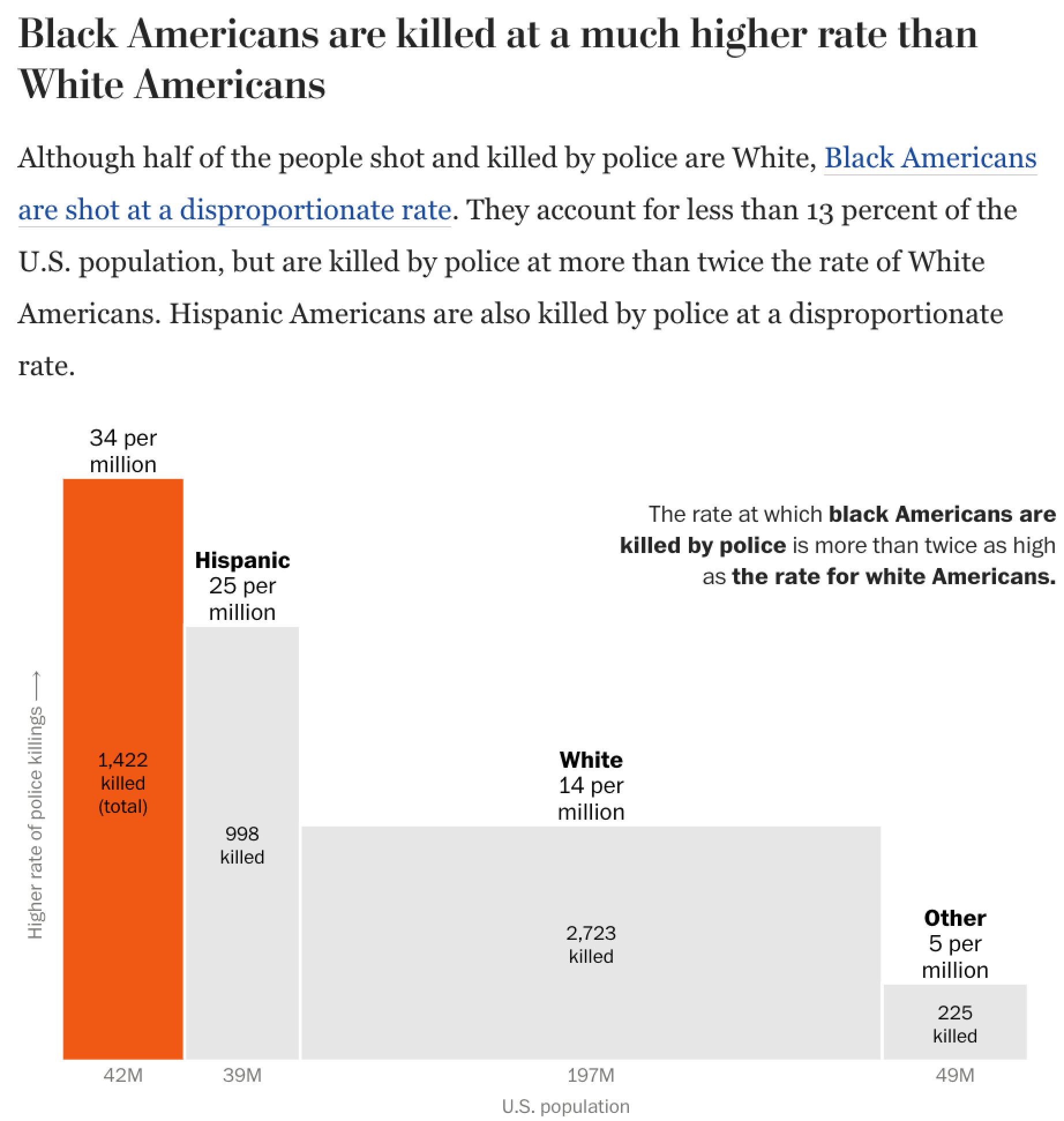 美国警察对不同族裔执法的双标行为,不仅表现在示威活动中,还存在于整个社会。《华盛顿邮报》回顾了2020年警察暴力执法的相关数据后发现,非裔美国人遭警察枪杀的概率,要高出白人2倍以上。2020年,每100万非裔中,就有34人遭警察枪杀,而这一数字在白人中仅为14人。