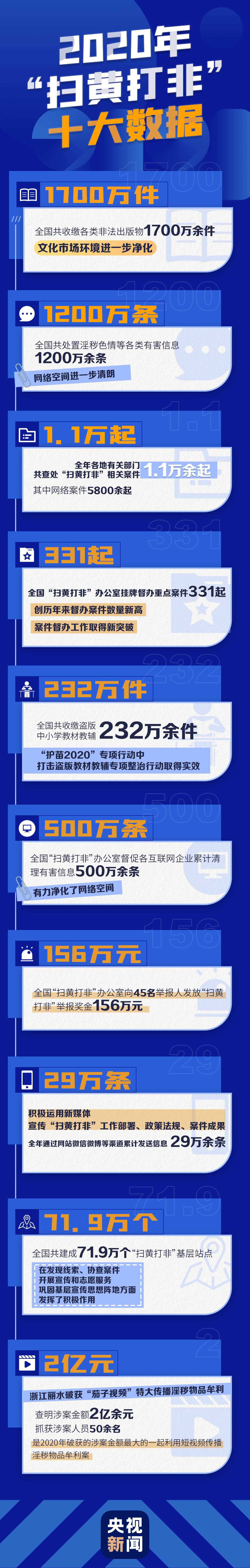 1700万件、1200万条、2亿元……这些数据代表啥?一图看2020年度“扫黄打非”工作十大数据