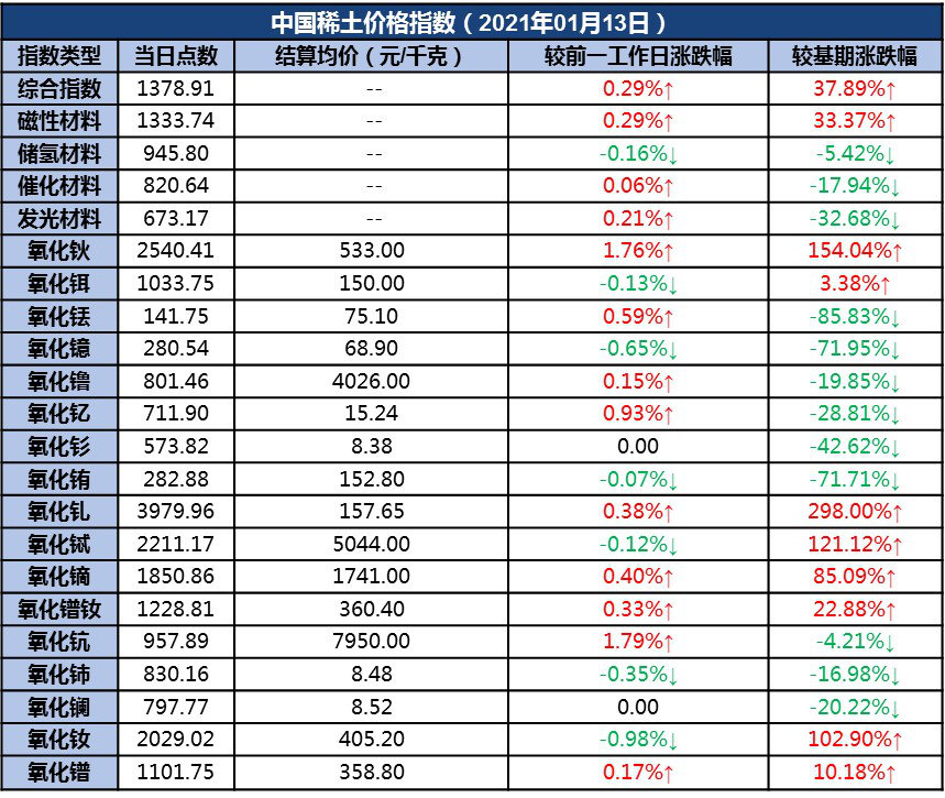 其中,氧化钬、氧化铥、氧化镥、氧化钇、氧化钆、氧化镝、氧化镨钕、氧化钪、氧化镨单品价格指数分别较前一工作日上涨;氧化铒、氧化镱、氧化铕、氧化铽、氧化铈、氧化钕单品价格指数分别较前一工作日下跌;氧化钐、氧化镧单品价格指数分别与前一工作日持平。