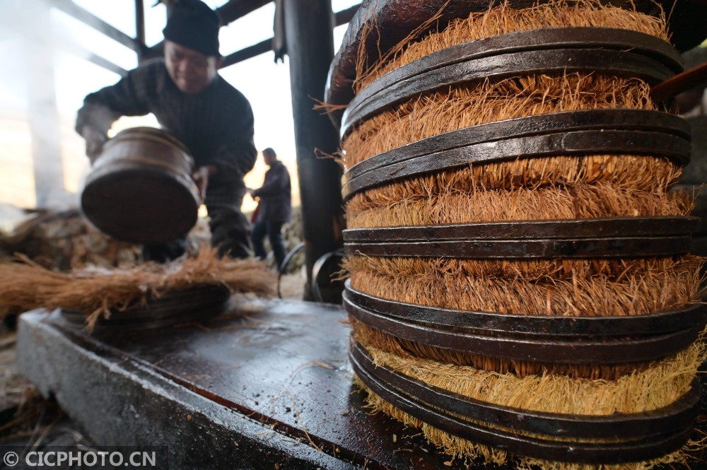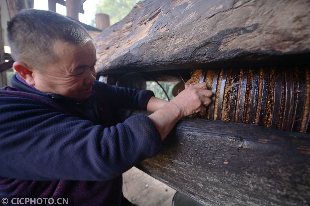 ↑2021年1月12日,在贵州省黔东南苗族侗族自治州从江县庆云镇转珠村,一名侗族榨油师傅在调整茶饼位置。CICPHOTO/吴德军 摄