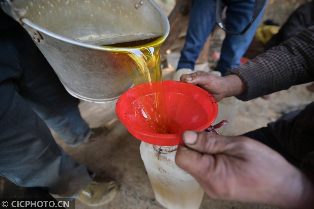 ↑2021年1月12日,在贵州省黔东南苗族侗族自治州从江县庆云镇转珠村,榨油师傅倒出压榨好的茶油。CICPHOTO/吴德军 摄