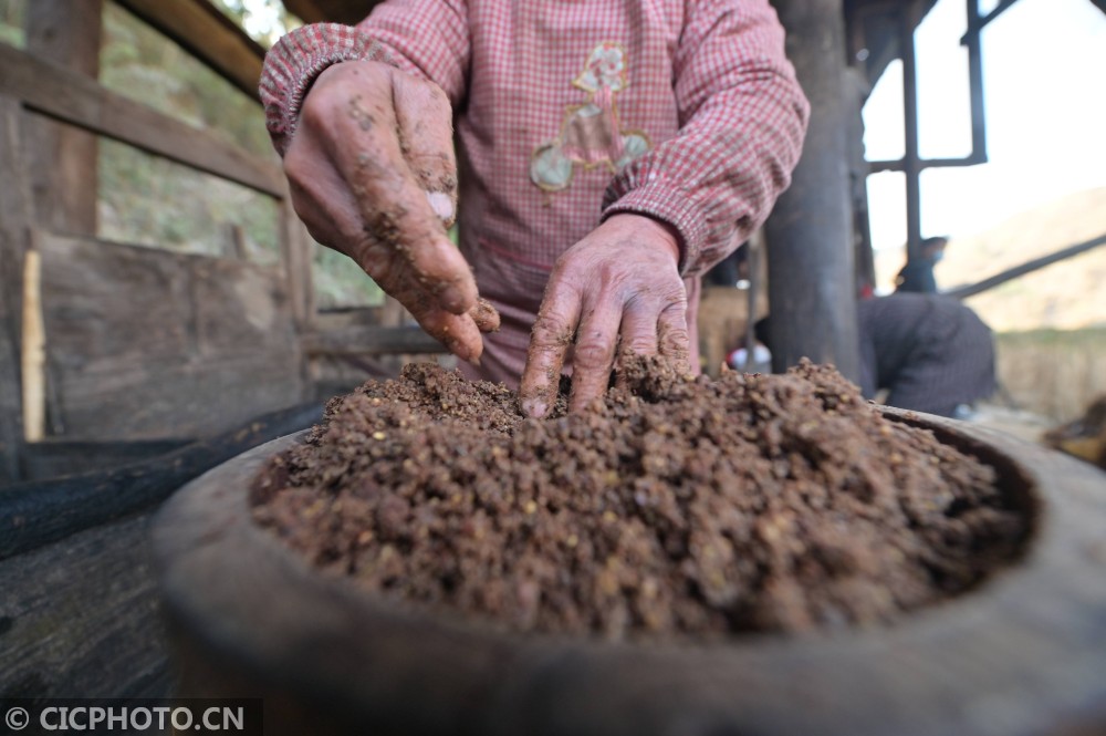 ↑2021年1月12日,在贵州省黔东南苗族侗族自治州从江县庆云镇转珠村,一名侗族榨油师傅在制作茶饼。CICPHOTO/吴德军 摄