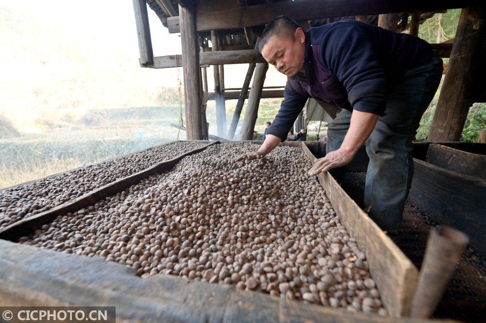 ↑2021年1月12日,在贵州省黔东南苗族侗族自治州从江县庆云镇转珠村,一名侗族榨油师傅在烘烤油茶籽。CICPHOTO/吴德军 摄