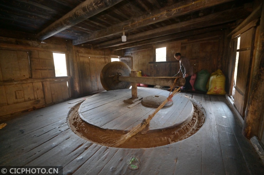 ↑2021年1月12日,在贵州省黔东南苗族侗族自治州从江县庆云镇转珠村,一名侗族榨油师傅在水碾房查看茶籽碾压情况。CICPHOTO/吴德军 摄