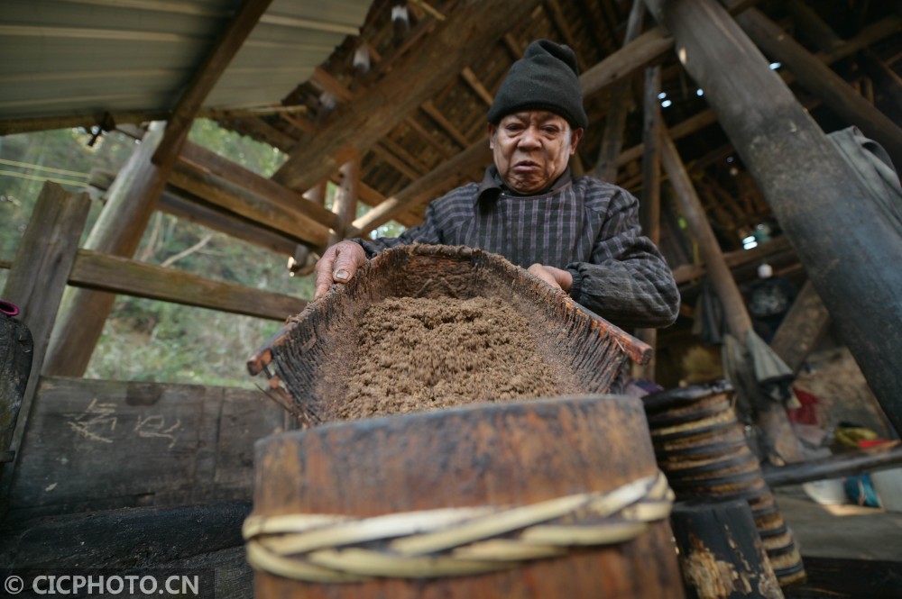 ↑2021年1月12日,在贵州省黔东南苗族侗族自治州从江县庆云镇转珠村,一名侗族榨油师傅在蒸茶籽粉。CICPHOTO/吴德军 摄