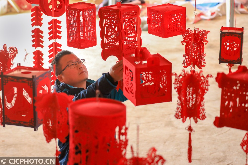 ↑2021年1月12日,在湖南省永州市东安县芦洪市镇一宫灯厂,彭中华在悬挂组装好的艺术宫灯。CICPHOTO/严洁 摄