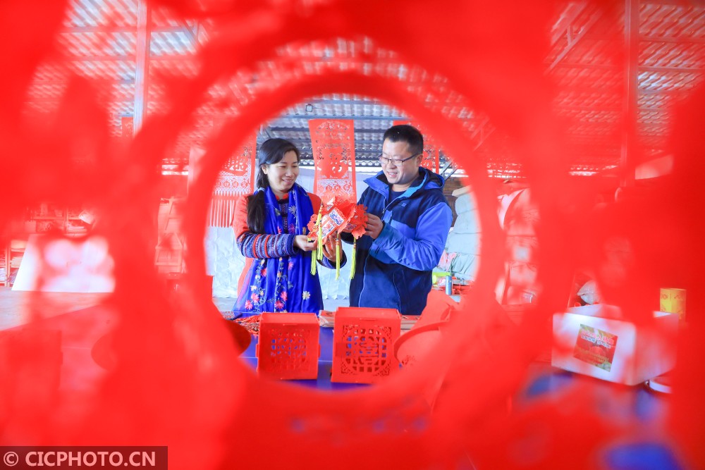 ↑2021年1月12日,在湖南省永州市东安县芦洪市镇一宫灯厂,易少玲、彭中华夫妇俩在商讨宫灯的设计与创作。CICPHOTO/严洁 摄