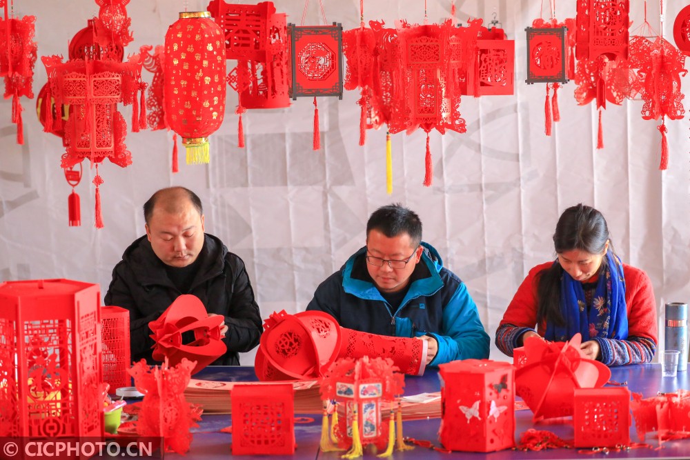 ↑2021年1月12日,在湖南省永州市东安县芦洪市镇一宫灯厂,彭中华夫妇俩与朋友一起组装发货。CICPHOTO/严洁 摄