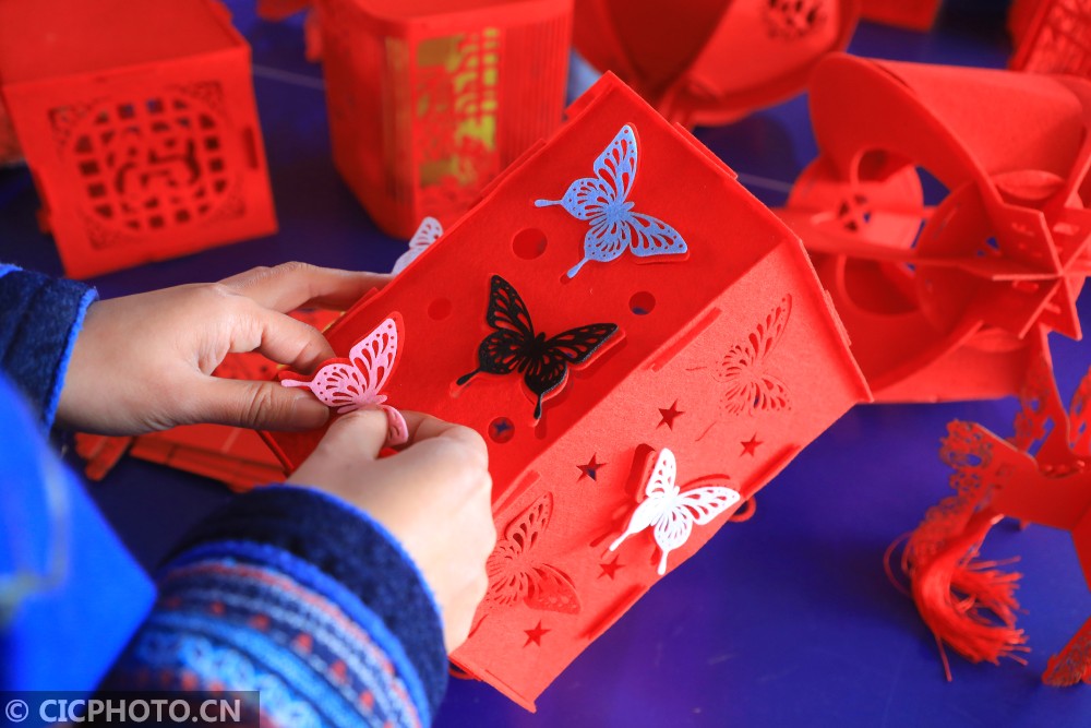 ↑2021年1月12日,在湖南省永州市东安县芦洪市镇一宫灯厂,易少玲在给艺术宫灯组装蝴蝶造型。CICPHOTO/严洁 摄